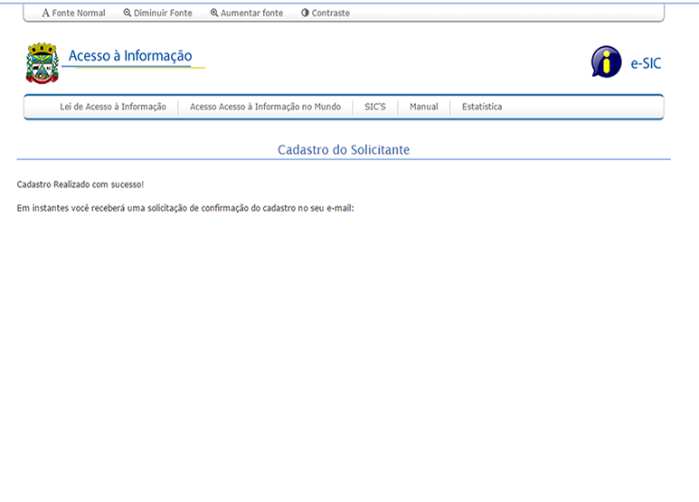 5. O link que o solicitante clicou no passo anterior irá redirecioná-lo (em nova janela) para a página confirmação de cadastro(figura abaixo);