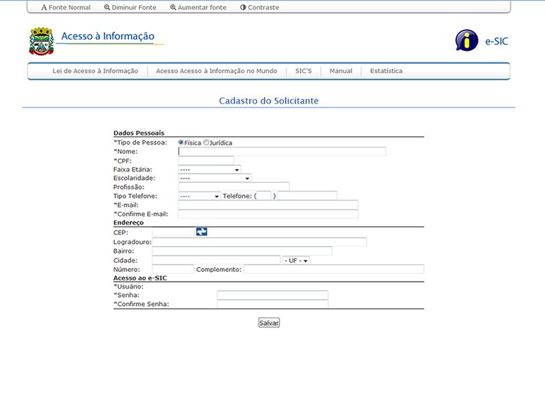 2. A tela seguinte é a de cadastro do solicitante, nela o usuário irá preencher os dados pessoais e em seguida clicar no botão salvar para que o seu cadastro seja efetuado (figura abaixo);